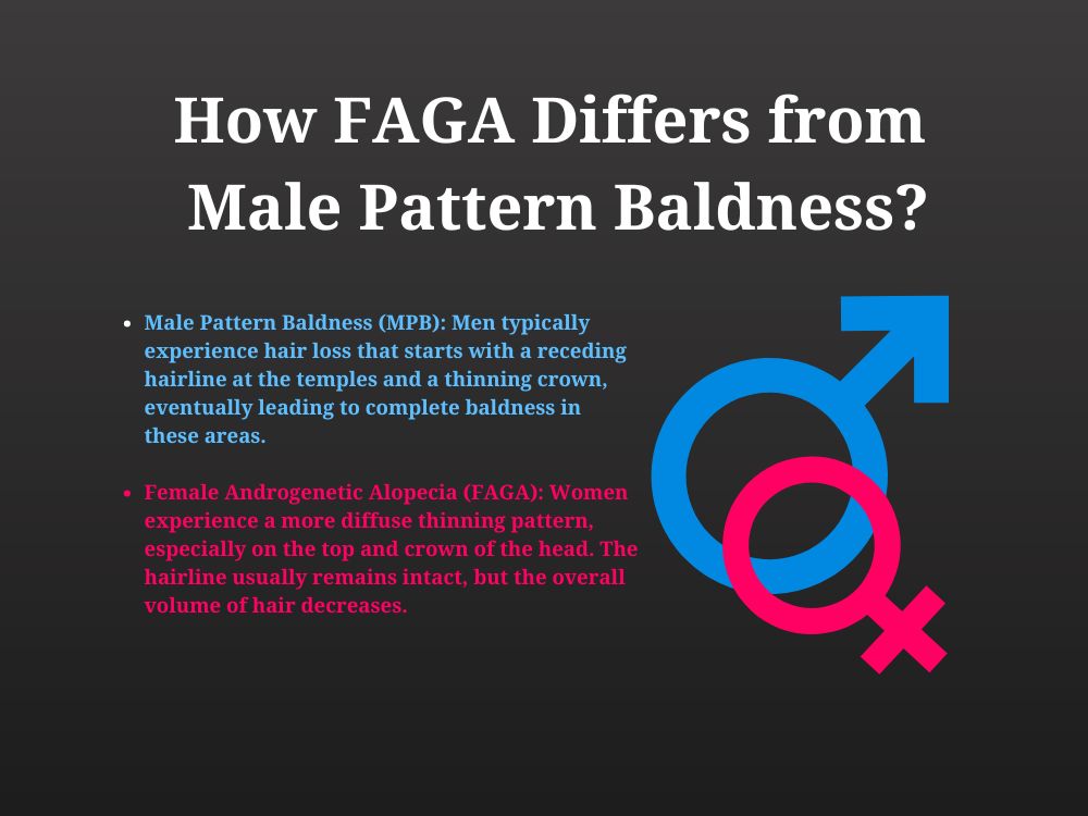 While both FAGA and male pattern baldness share a genetic link and are influenced by androgens, there are several key differences between the two conditions: